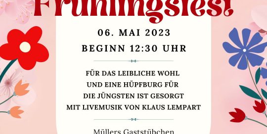 Janick Schmitz2023-04-12T10:38:51+02:00Der SPD-Stadtverband Neuwied lädt erstmals herzlich zum Frühlingsfest ein am Samstag, den 06. Mai, ab 12:30 Uhr. Die Veranstaltung wird auf der Terrasse des „Müllers Gaststübchen“ in der Dierdorfer Straße 59 in Neuwied stattfinden. Für die Jüngsten wird es eine Hüpfburg geben, fürs leibliche Wohl wird bestens gesorgt sein und Musiker Klaus Lempart wird [...]